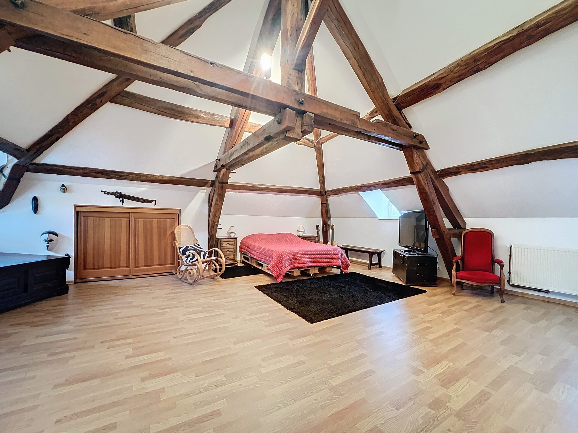 Au deuxième étage un bel espace avec poutre apparente idéal pour une salle de jeu ou cinéma et d'un espace parentale avec WC.