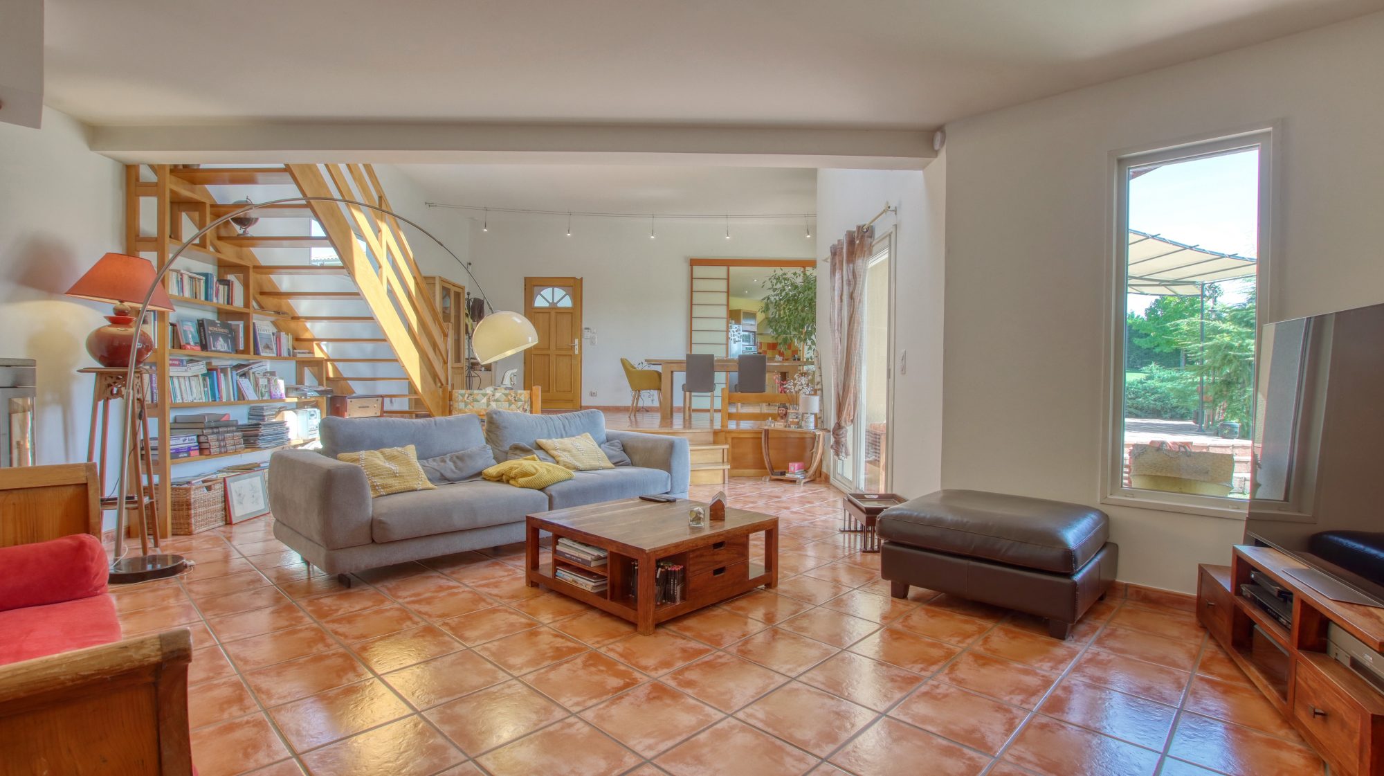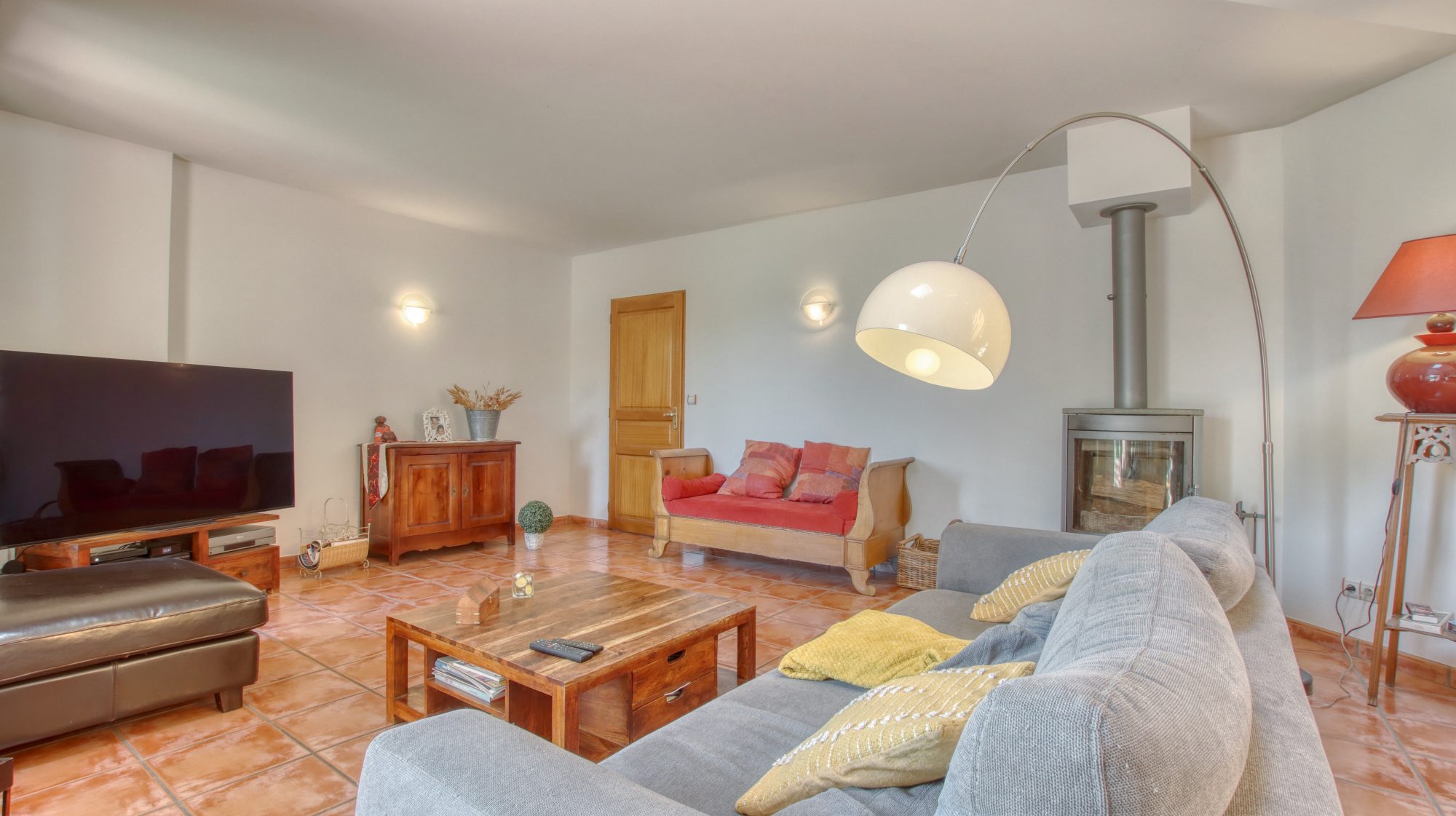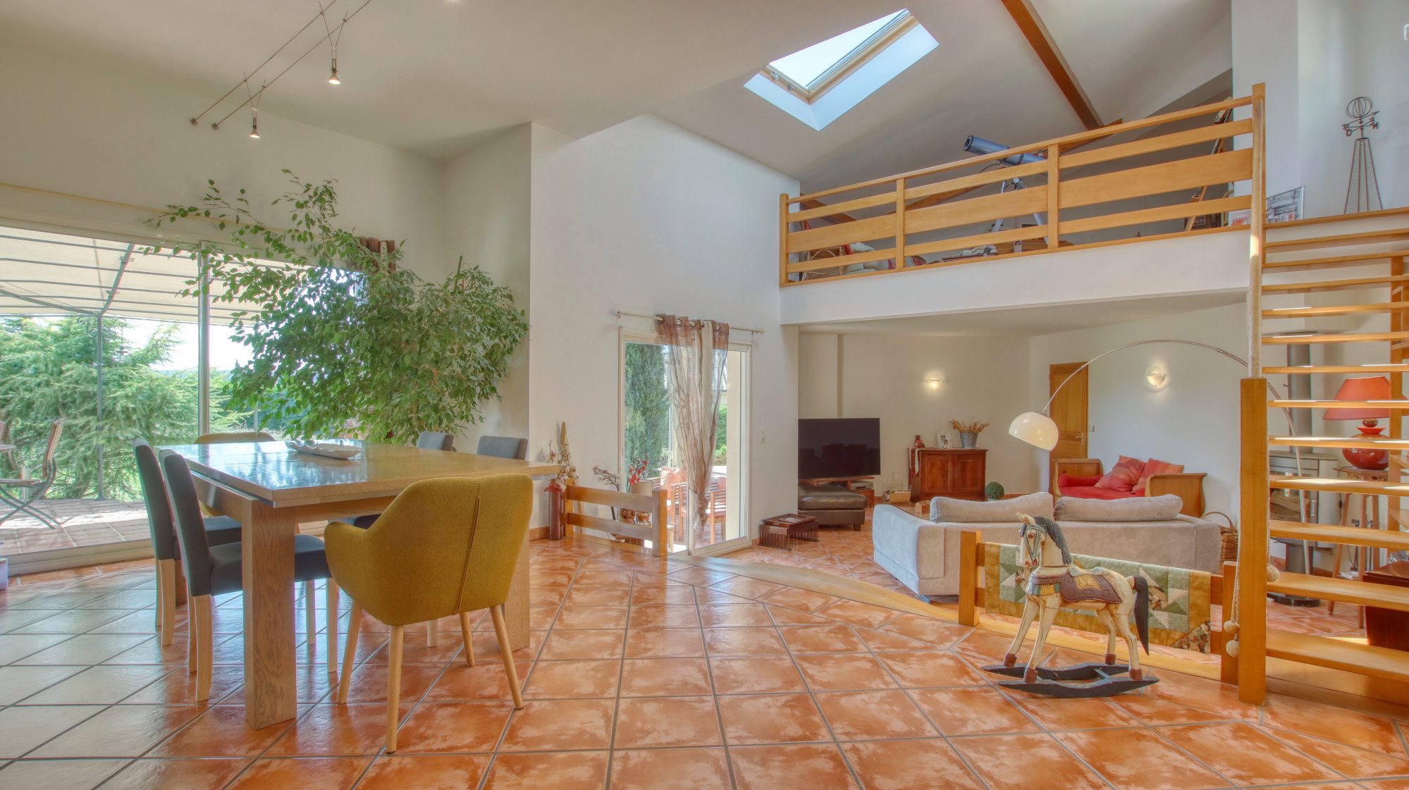 Un grand séjour salon cathédrale avec un poêle à bois et plancher chauffant au gaz , une cuisine ouverte , ainsi qu'un cellier avec accès au grand garage double de 41,76m2 , un sous-sol avec cave et accès au vide sanitaire.