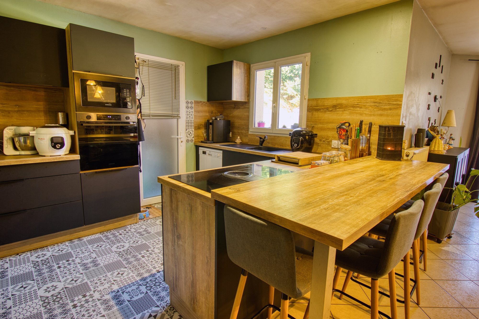 Cette première maison se compose d’une entrée avec rangements, d’une belle pièce de vie ouverte sur une terrasse d’environ 120 m², et d’une cuisine récente, moderne et entièrement équipée.