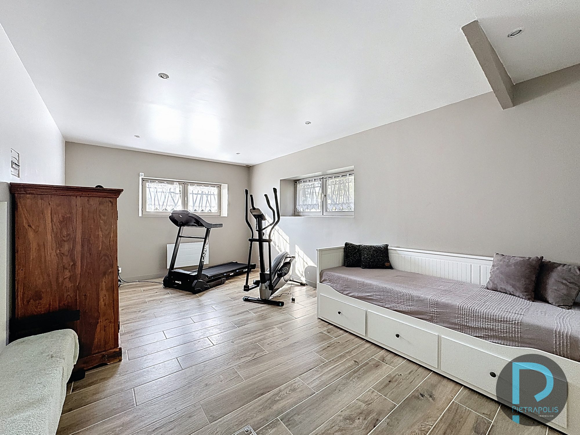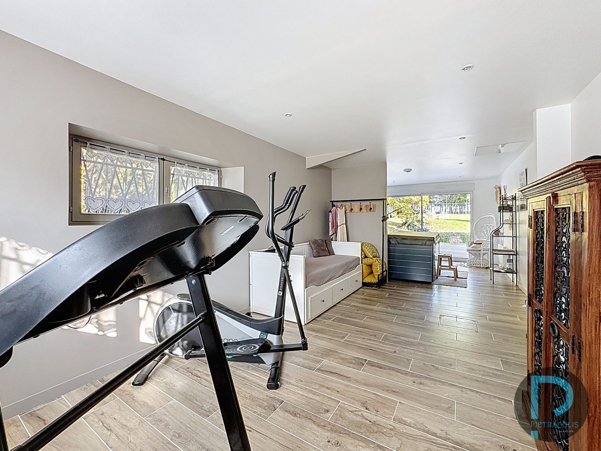 Au rez-de-chaussée, une salle de sport de 35 m² avec jacuzzi, un chauffage central au fioul neuf, volets roulants électriques et aussi équipée de panneaux solaires. Un grand garage en sous-sol offrant de belles capacités de stockage.