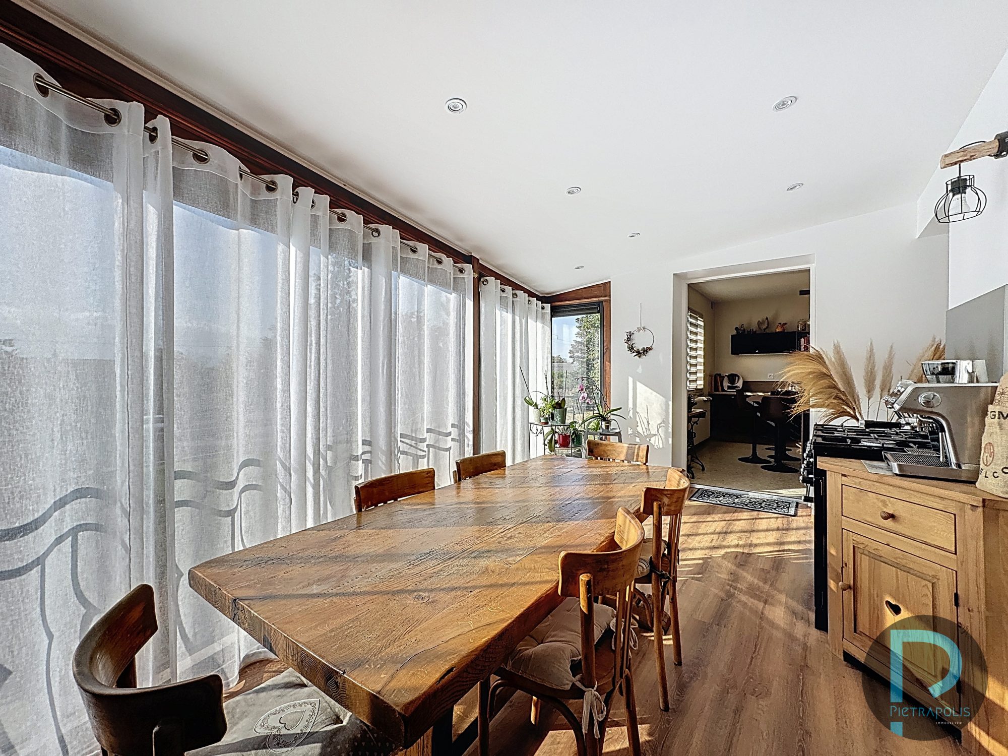 Grande pièce de vie de plus de 50 m² avec cheminée insert et accès sur deux vérandas conviviales, une cuisine entièrement équipée avec arrière-cuisine, trois chambres, dont une spacieuse suite parentale et un bureau idéal pour le télétravail.