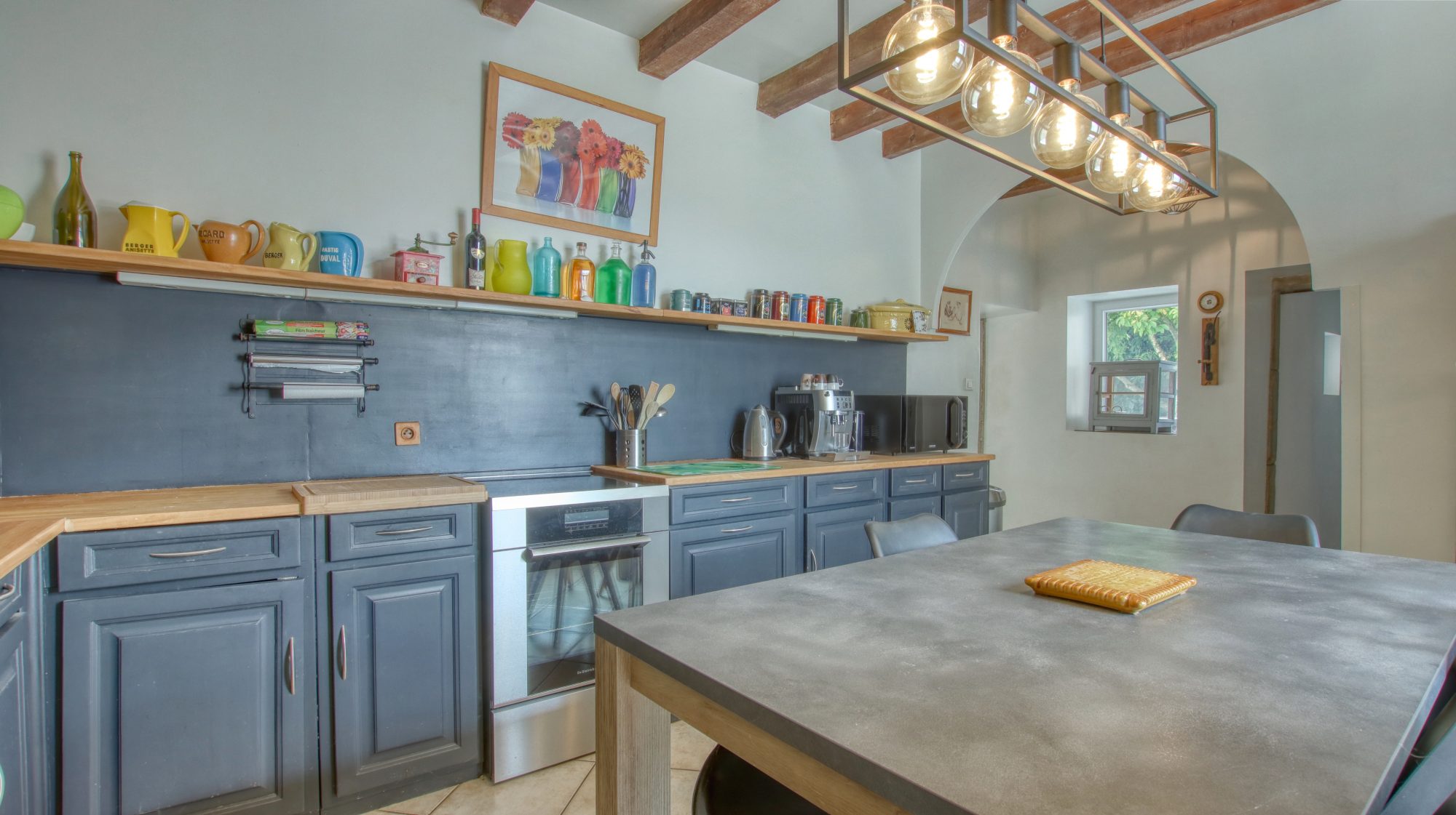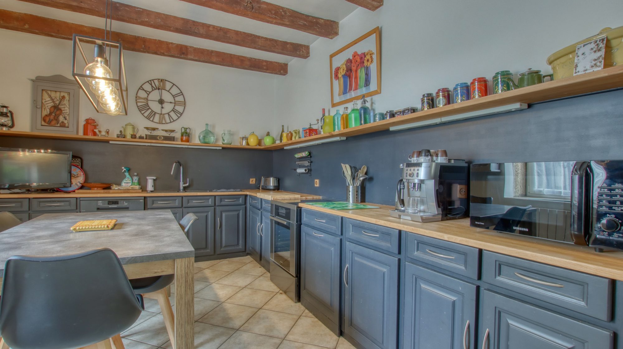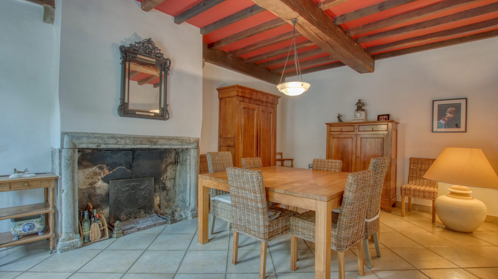 Dans la partie maison du XVIIᵉ, vous trouverez en rez-de-chaussée, une belle cuisine indépendante, aménagée et équipée, communiquant harmonieusement avec le salon et la salle à manger, pièces lumineuses exposées plein sud.