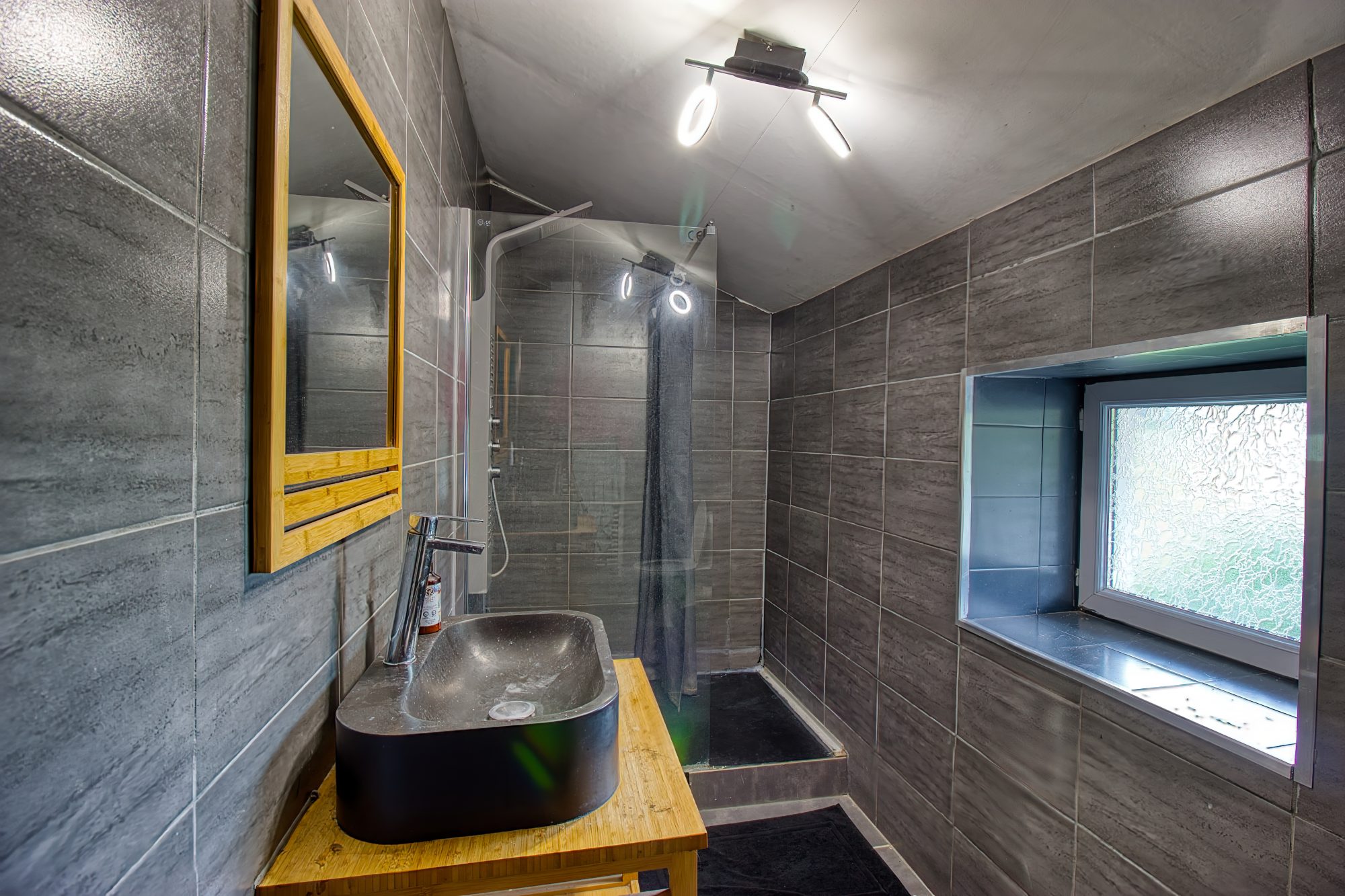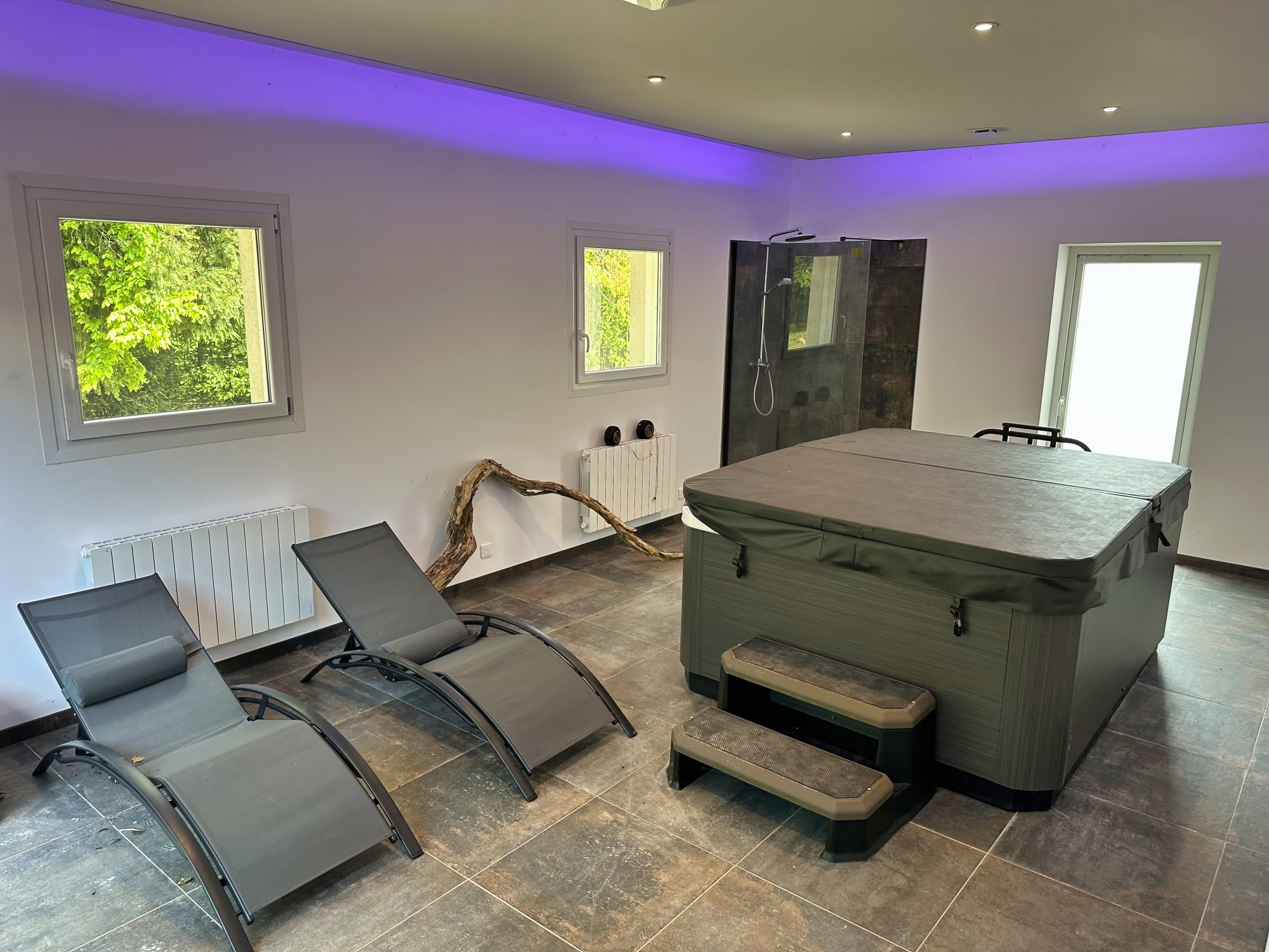 À l’extérieur, le jardin se déploie comme un écrin de verdure. La piscine rythme les beaux jours, et l’espace détente – jacuzzi et douche – accolé à la maison, prolonge cette douceur de vivre depuis l’intérieur vers l’extérieur.