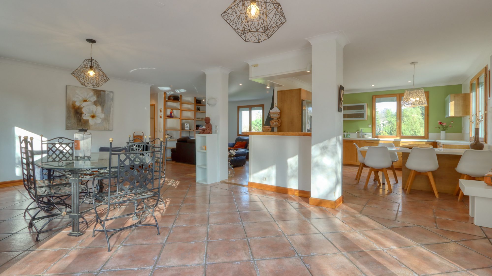 Une pièce de vie de 70m2 avec un salon , séjour , cuisine donnant sur la grande terrasse avec une pergola bioclimatique.