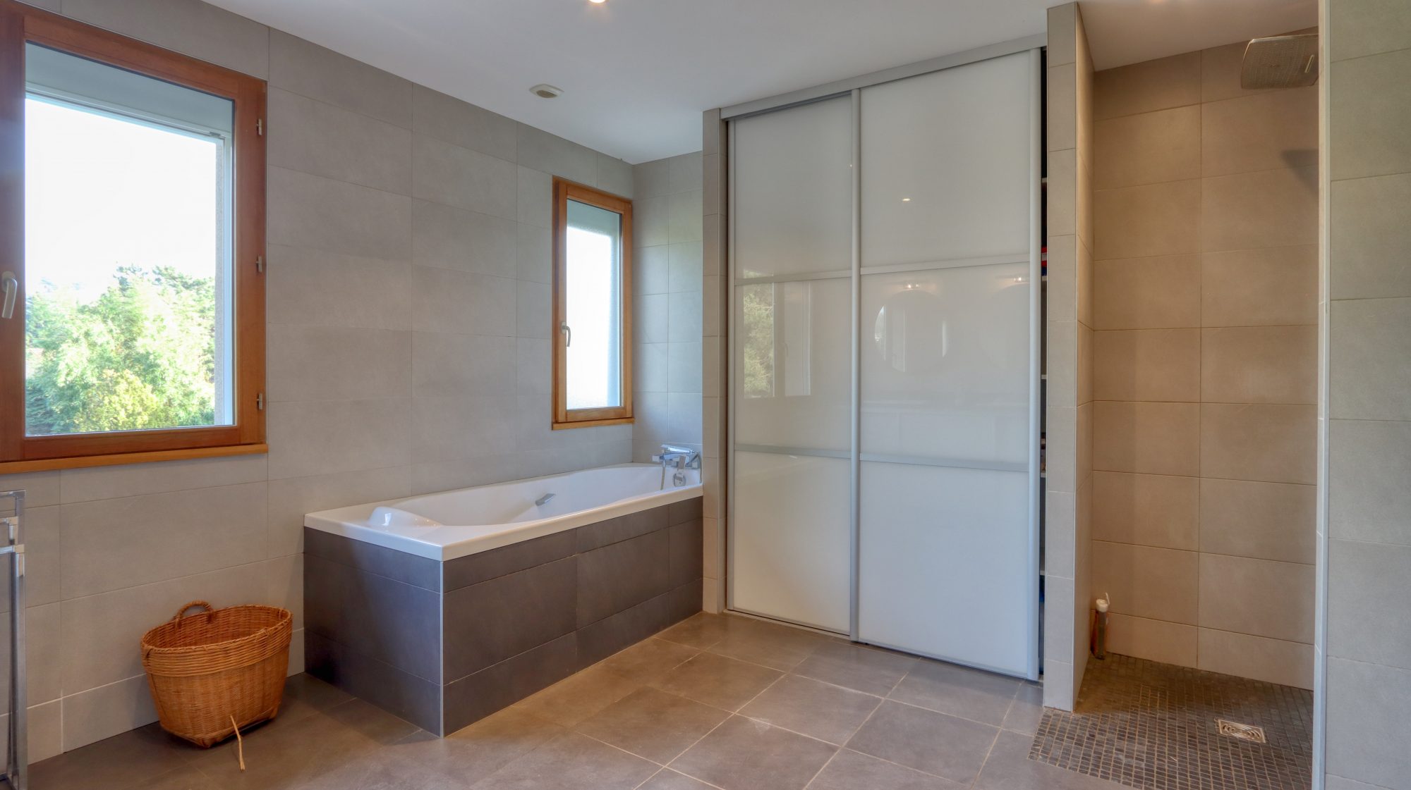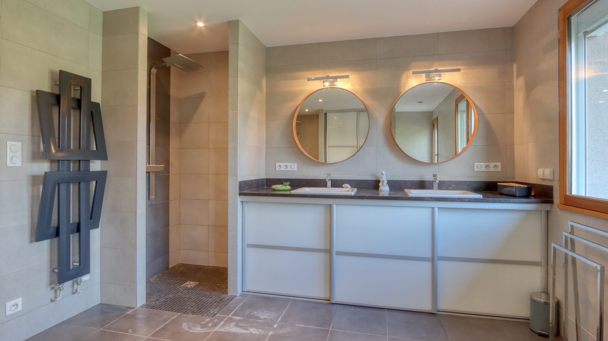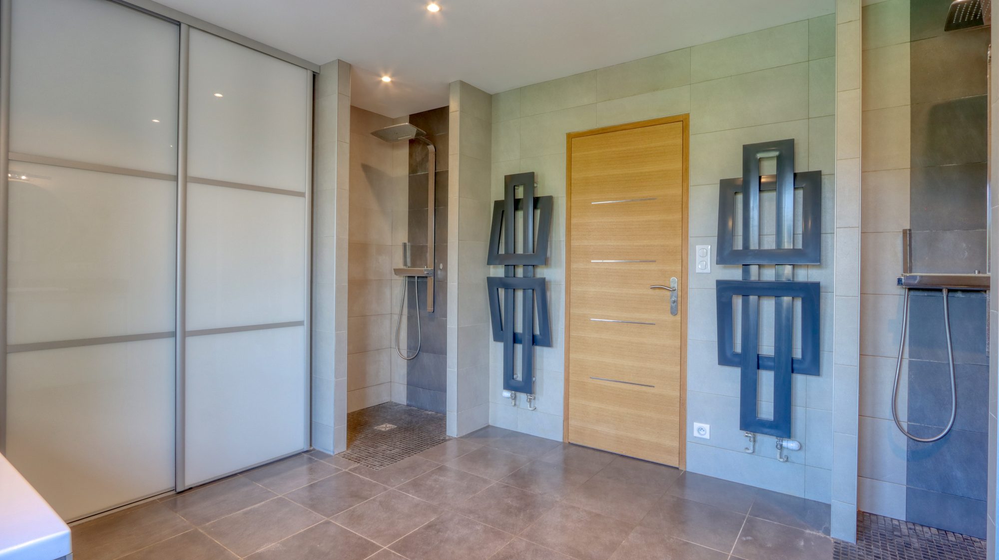 Une grande salle de bain avec 2 douches et double vasque ainsi qu'une chambre avec dressing.